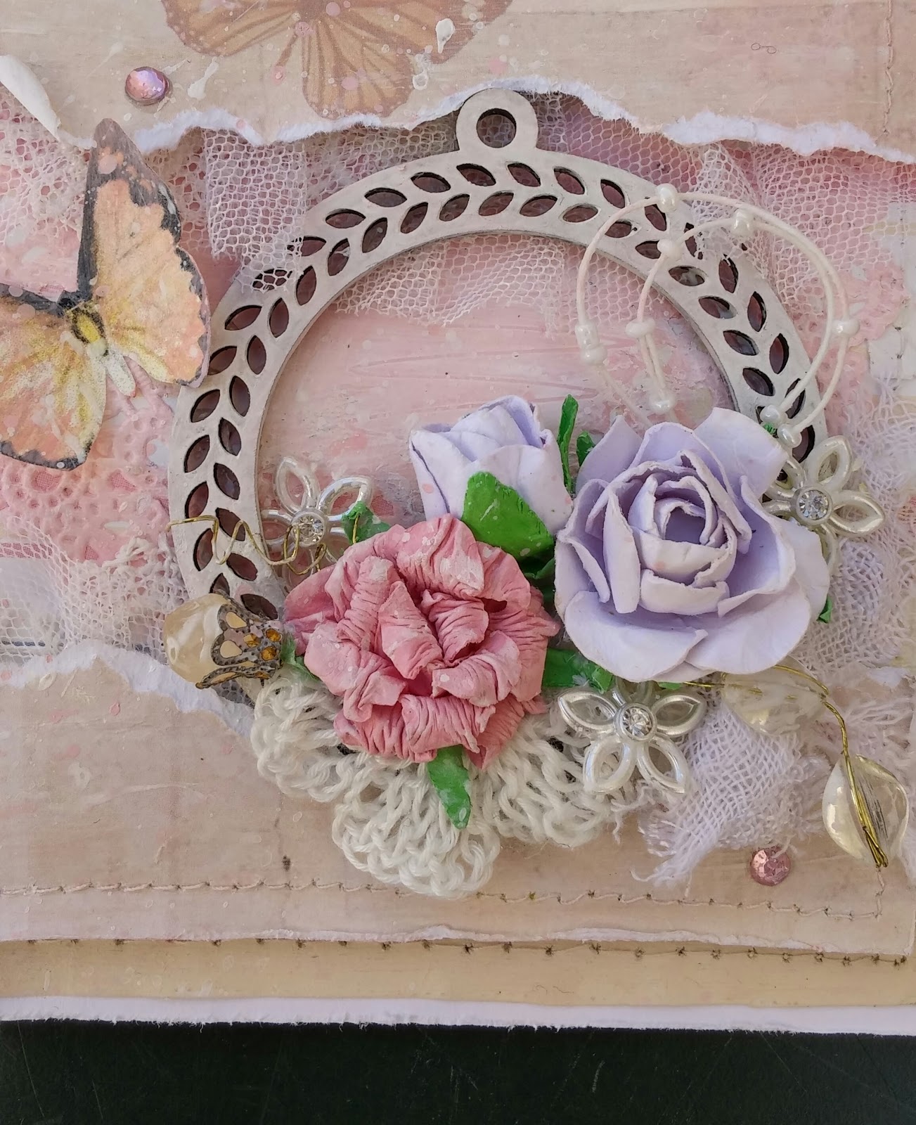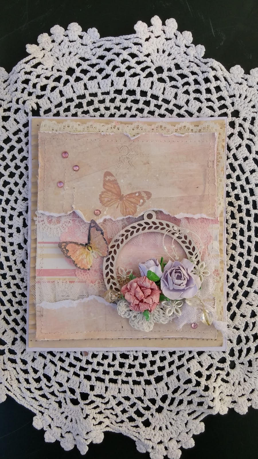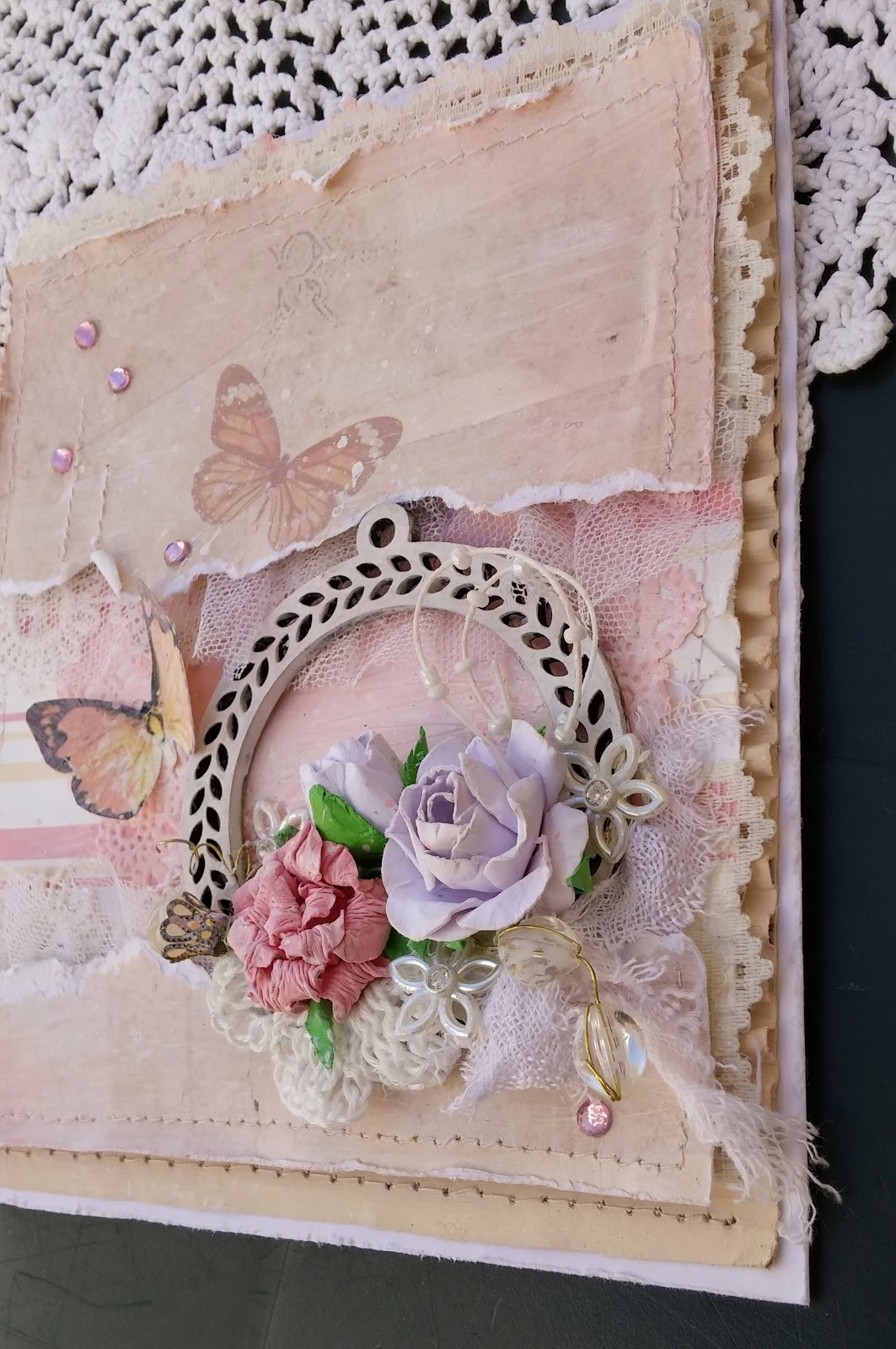 В жизни открытка более нежная-фото к сожелению не передают всех цветов.В декоре использовала цветы ручной работы,чипборд,кружево,фатин,кристалики.