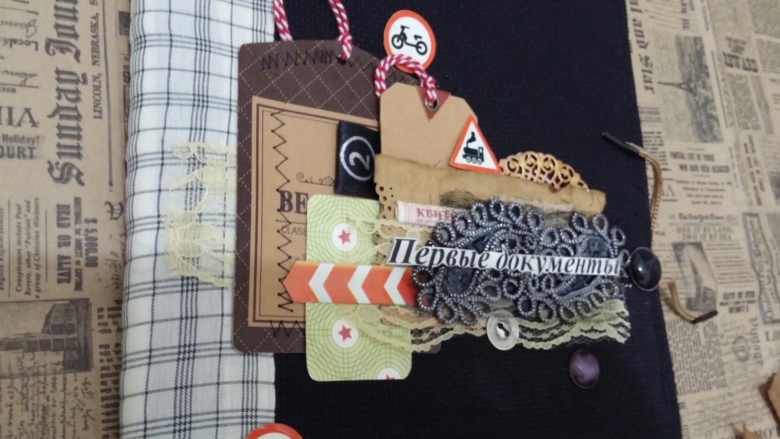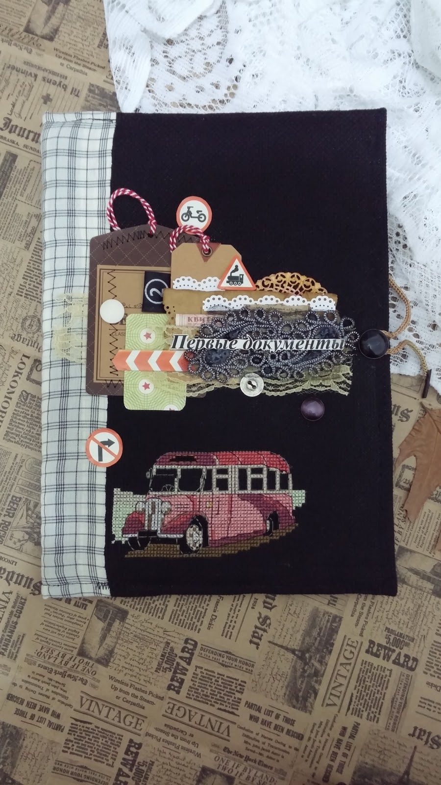 Здраствуйте!сегодня я зделала папку для первых документов моего сына.Сейчяс ему 3 года И одним из первых его слов(ну кроме мама и папа) был автобус.Именно поэтому я использовала его в своей роботе.Я зделала вышивку и украсила обложку братсами, пуговками, тежиками, кружевом,а также машинной строчкой для прочности.