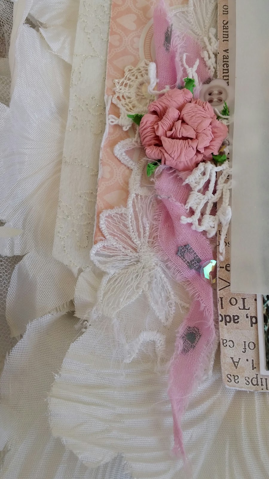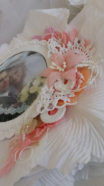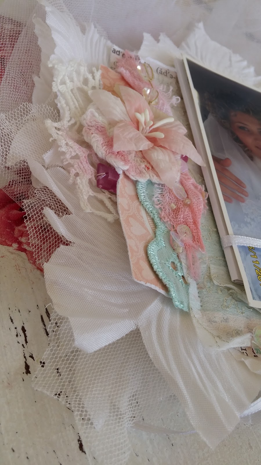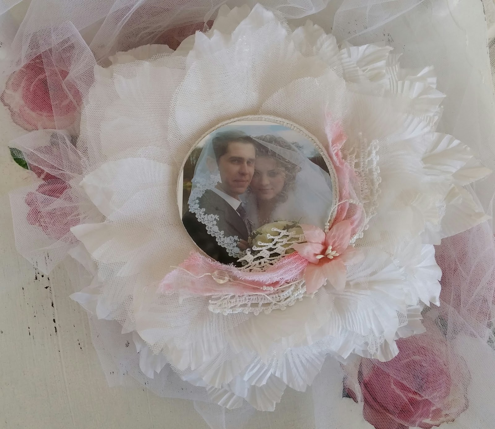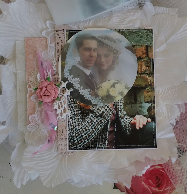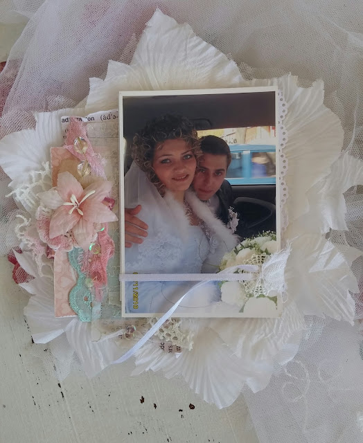 Сложно было воплотить свои мысли в реальность. Хотелось чтобы во-первых цветок был нежным воздушным ,во-вторых -тканевым, в -третьих чтобы сами лепестки были украшением каждой странички и в итоге создавали большой пушистый цветок. Перепробовав все известные мне пути создания лепестков и разные ткани (я и опаливала и прошивала ,обшивала....) -результат меня не радовал. На помощь пришёл YouTube. Для создания своих лепестков я использовала технику холодного гафрирования. Результатом я довольна и очень надеюсь что вам также как и мне понравится что у меня в итоге получилось. Замучила...да?! А вот и сам виновец моих недоспанных ночей. Альбом сделан с пивного картона( основа-круг), обтянут тканью и наверх нашиты тканевые лепестки. И все это держит вместе отрез фатина . Размер каждой следующей страницы больше предыдущей. Первая основа 17,5 см а последняя около 20 см. Обложка украшена также лепестками из фатина(он нажелатинен поэтому держит форму и придает обьем) ,кружевом, вязанной рамочкой, крашенной тканью, цветком лилии и шнуром с бисером и камушками